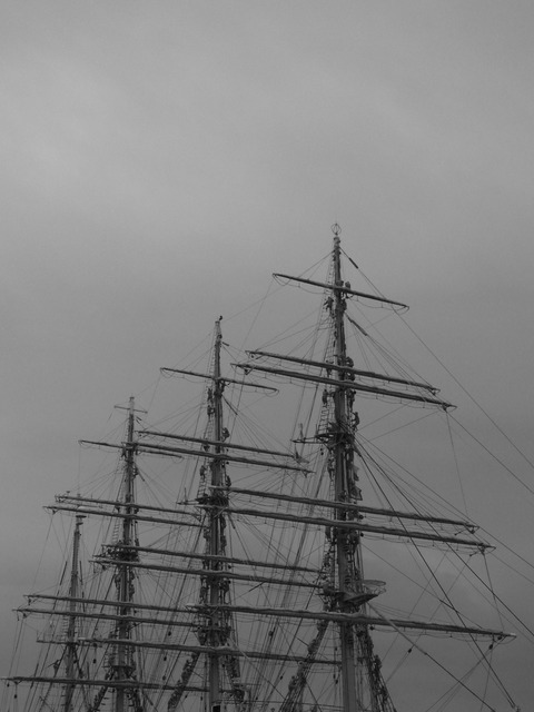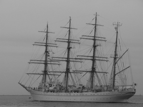 曇り空の下、海の貴婦人と称される帆船海王丸の実習生がマストやヤードに登り「ごきげんよう」の三声で神戸港を出港。