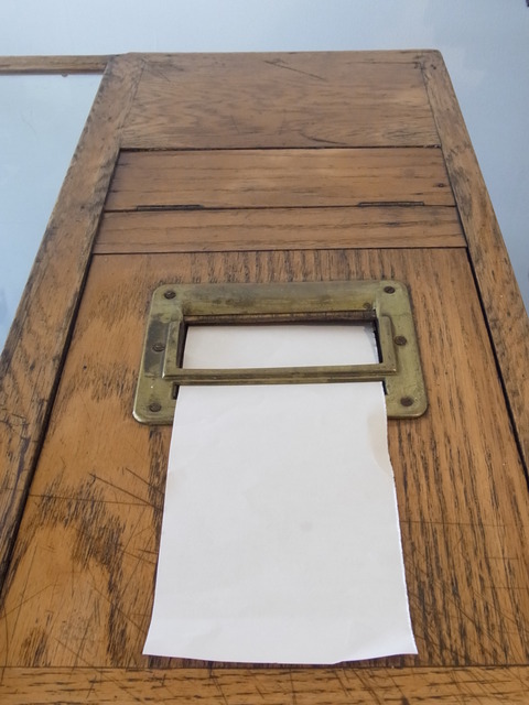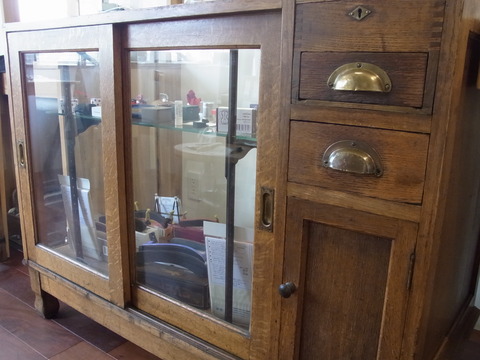 イングランドの古い什器を配置。全体のバランスも良く、細部にこだわりを感じます。ガラスや足回りの傷痕を見ながら、[未来は過去の中にある]などと想像しながら展示は終了。
